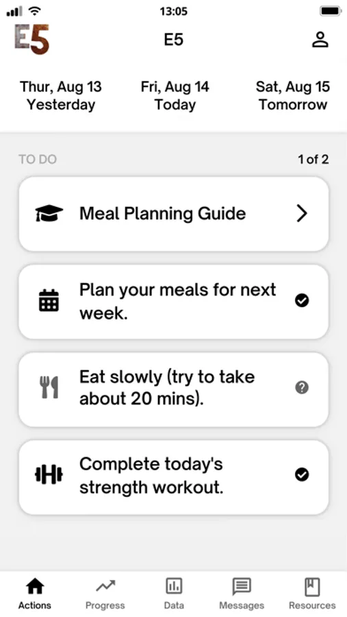 The E5FIT app is designed for clients of trainers who have enrolled in the E5FIT program. The app will send push notifications and prompt clients to answer yes/no question in regards to comply with healthy habits sent by your coach.