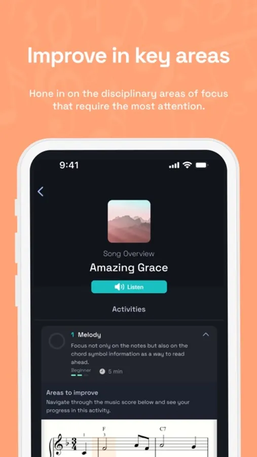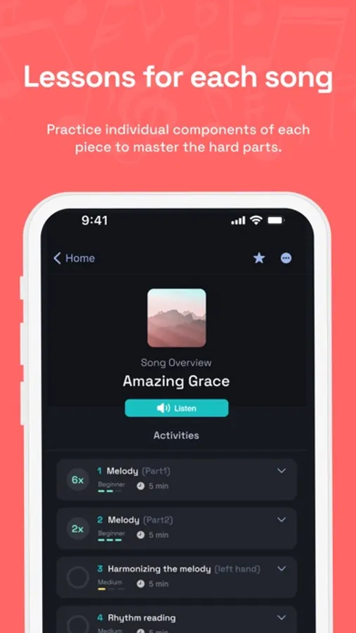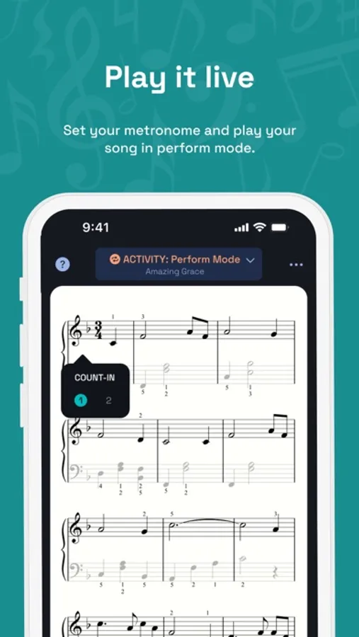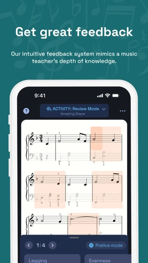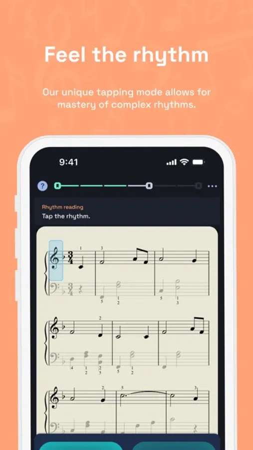 Practice → Build your confidence by tackling individual components of each piece, like the rhythm via our unique tapping mode. As a great coach once said, perfect practice makes perfect.