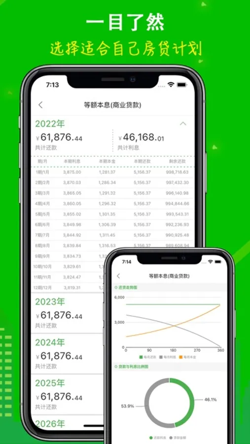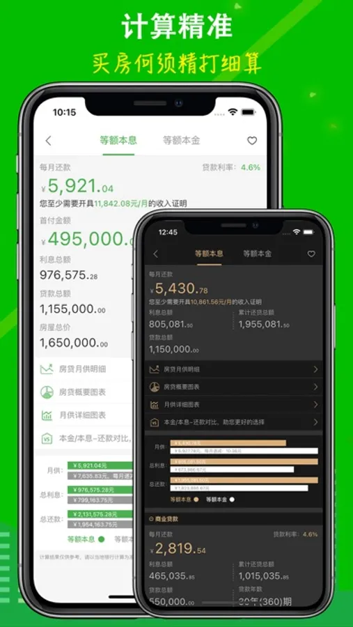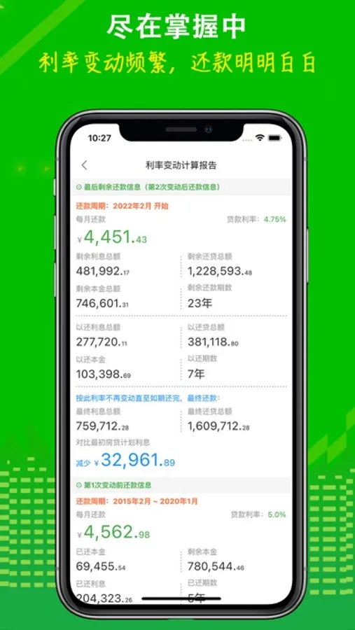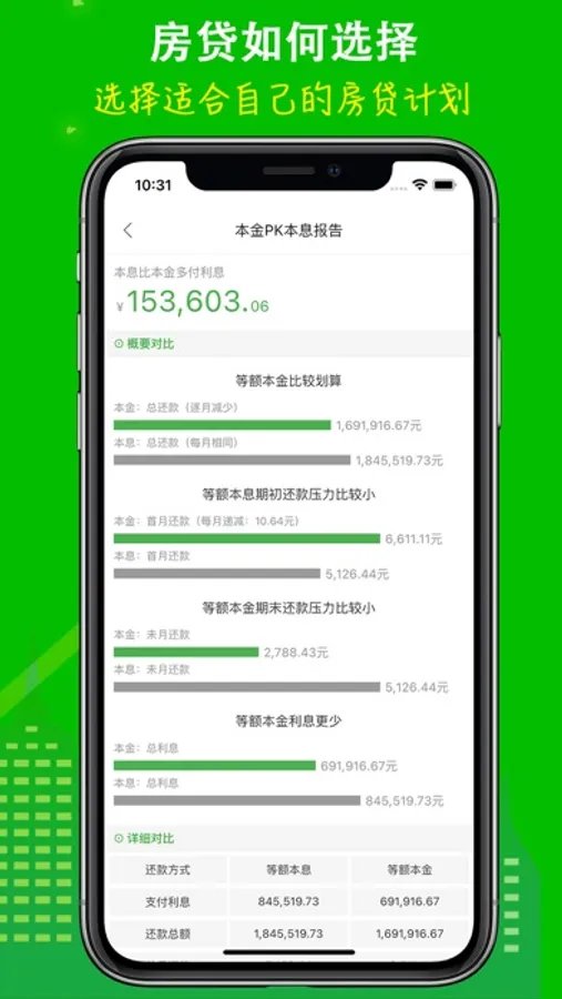 提供每月详细的等额本息和等额本金的商业还款报告/公积金还款报告/总还款报告。更为直观的统计报表及月供图表,一目了然的月供数据,让您的更清晰直观了解数据。
