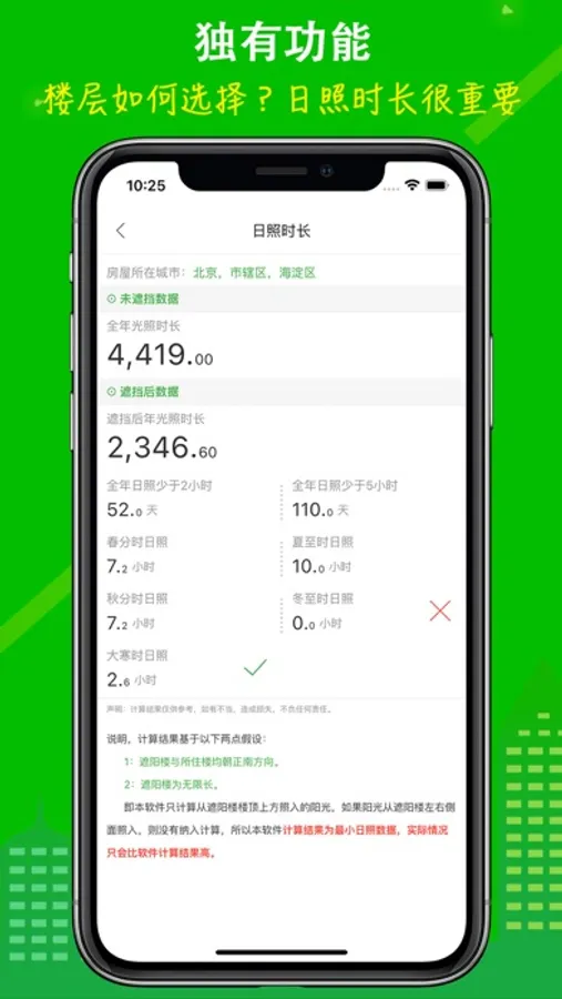 不同的楼层受日照的照射时长不一样,通过软件的计算能轻松知道不同的楼层的日照时长,更好方便选择楼层。