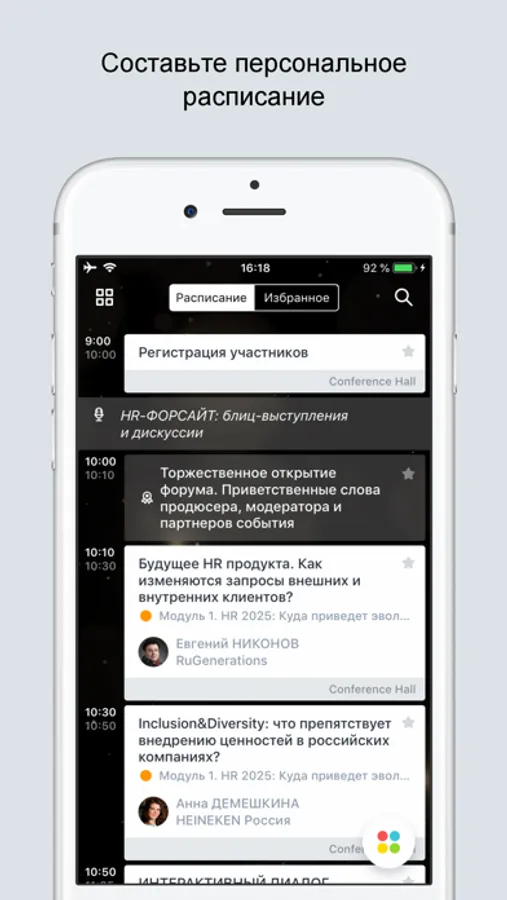 - Следить за обновлениями в расписании мероприятия, составе спикеров и тем в режиме реального времени