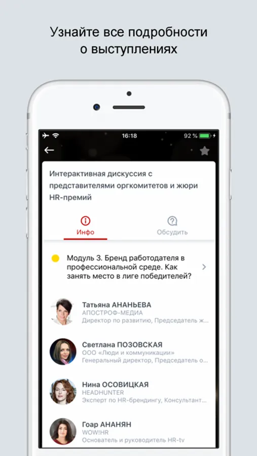 - Получать актуальную информацию о программах и спикерах, интересующих вас событий