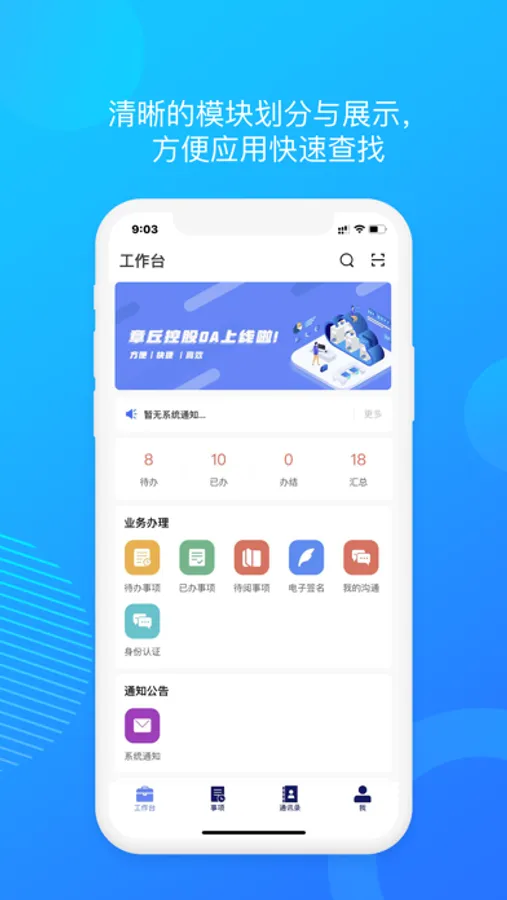 章丘控股OA手机版客户端是PC以外的延伸使用,用户无需电脑就可以在外边通过APP进行办理事项。充分利用信息技术,以信息传输和文件共享为重点,统一规划,建立统一的 OA 系统,各部门可以通过系统输入信息、共享文件。以实现企务公开,缩减报批时间,简化审批手续,提高工作效率。通过计算机技术实现包括集团内部及二级单位日常办公自动化、信息共享、沟通平台、专业化管理、整合平台等信息系统,满足办公需求,从而提高集团的整体管理效率和办公效率。
