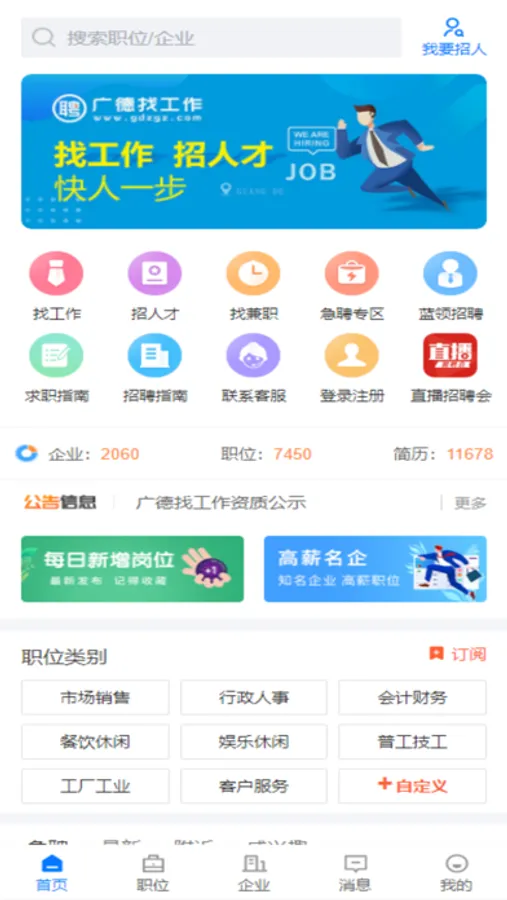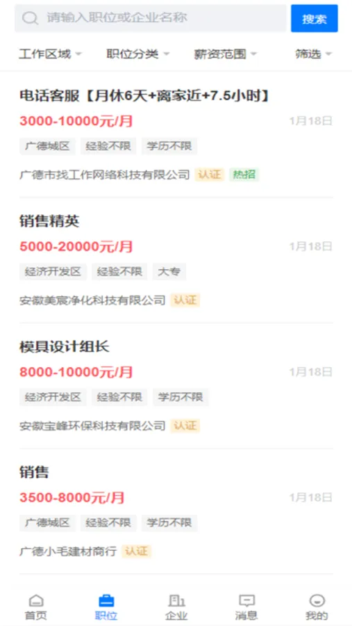 在广德找工作,就上广德找工作网。 广德求职必备首选APP,海量高薪职位每天更新。 【招聘更专业】专注广德本地招聘,每日更新海量信息! 【职位更全面】海量本地职位,只要你自信! 【职位更精准】严格的审核机制,虚假企业零容忍! 【求职更高效】与企业直接沟通,当场拍板,闪电入职! 【求职更安全】设有企业屏蔽沟通功能,完全保障你的个人隐私!
