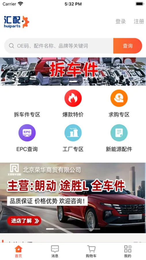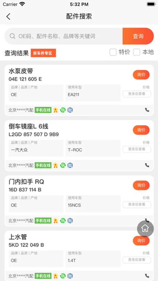 汇配APP主要针对从事汽车零配件销售的配件商、修理厂、4s店、配件工厂开放,提供全国汽配库存共享服务,包含各类车型的全车件和易损件,以及拆车件、特价处理配件等。主要功能包括: