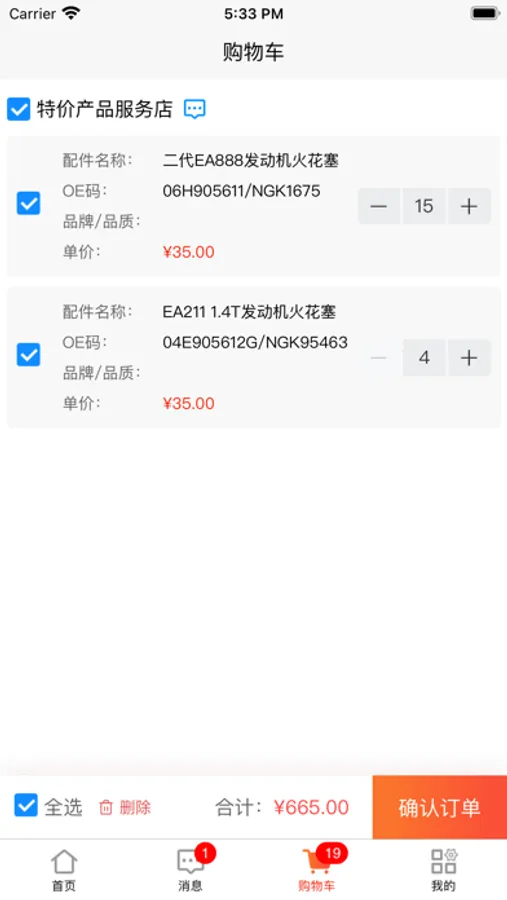 2、购物车:搜索到有价格的配件,可以点击直接购买进入订单结算页面。或者点击加入购物车,选择购物车中要购买的配件点击进行结算进入结算页面。