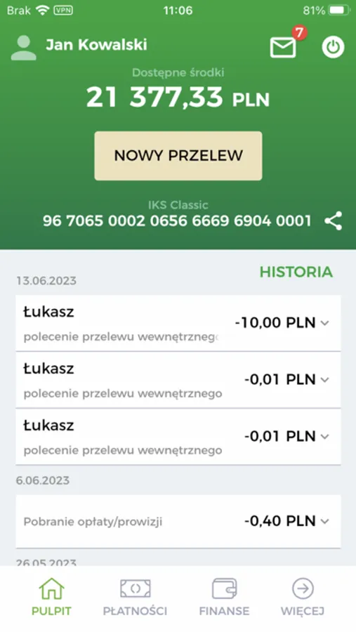 • Szeroki wybór transakcji – obsługa lokat, przelewów natychmiastowych i własnych, zlecenia stałe, przelewy z datą przyszłą, przelewy podatkowe i przelewy podzielony VAT.