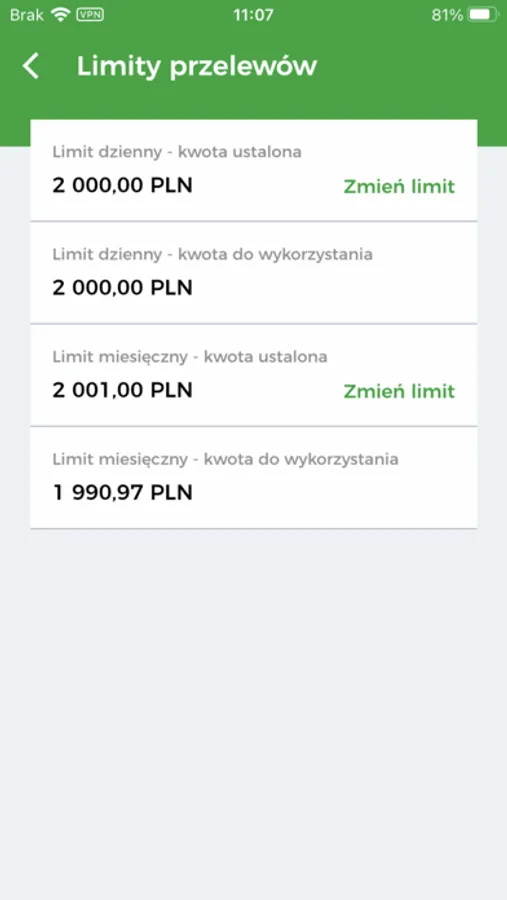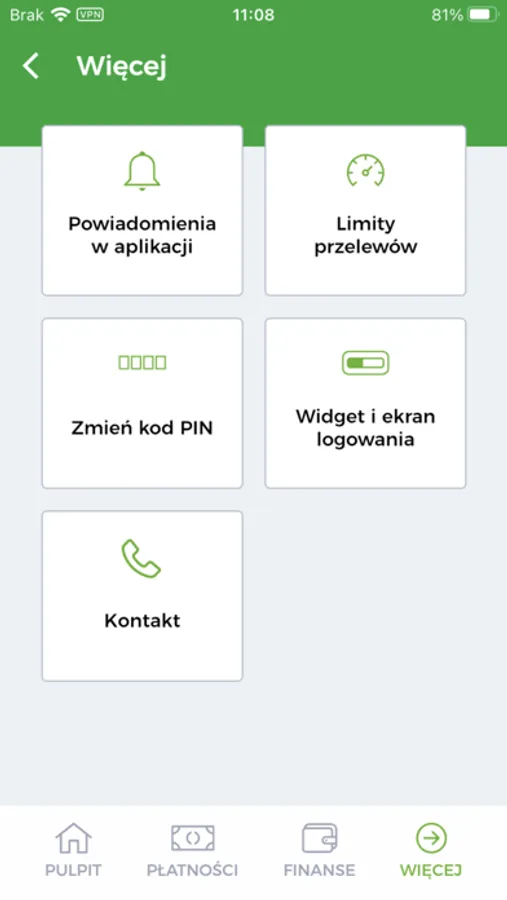 • Zarządzanie kartami debetowymi do rachunków – zmiana limitów transakcyjnych, włączenie i wyłączenie płatności zbliżeniowych, zastrzeżenie karty.