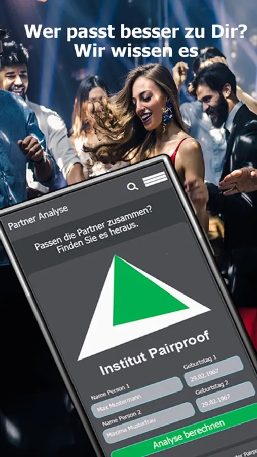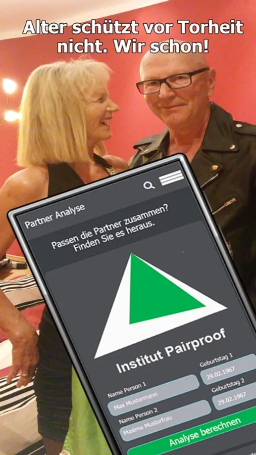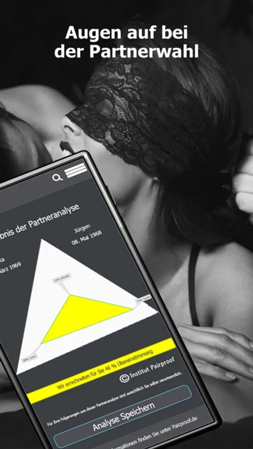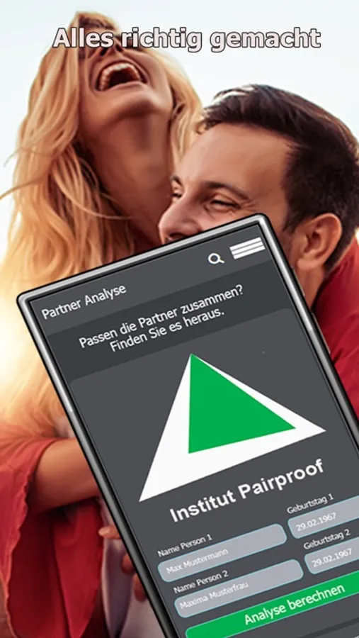 Machen Sie ein Vorauswahl Ihrer Partner über die Partner Analyse App des Instituts Pairproof. Kommen Sie mit dem angedachten Partner in den grünen Bereich einer Partnerschaft, können Sie auch die anderen Kriterien einer Partnerschaft auf Kompatibilität prüfen.