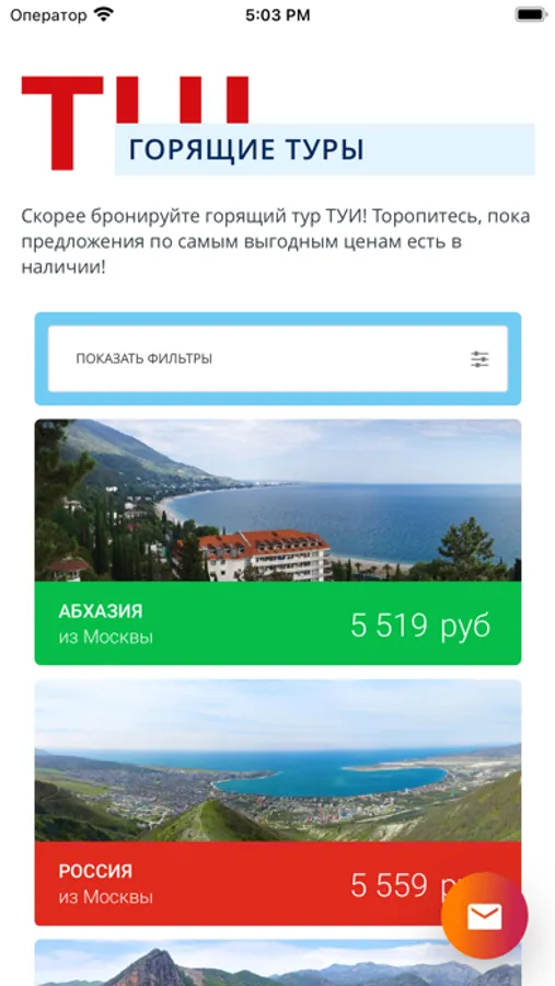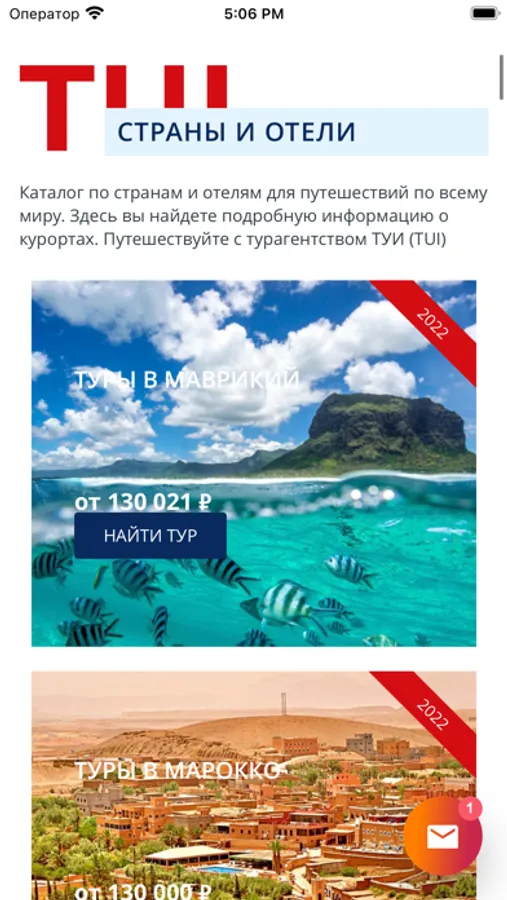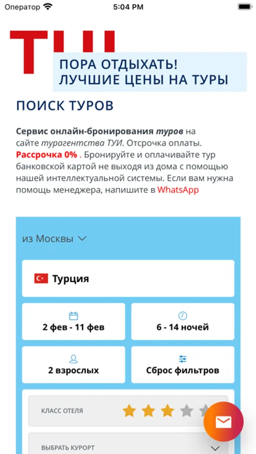 Приложение Турагентство ТУИ - Горящие туры, Отели 5*, Поиск туров в режиме онлайн. Бронирование туров в два клика и без регистрации. Цены в поиске туров актуальные, с учётом всех доплат!