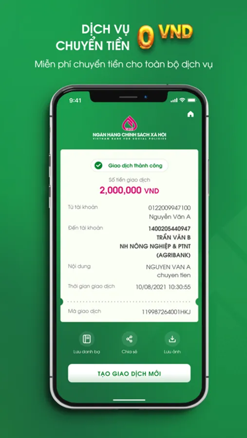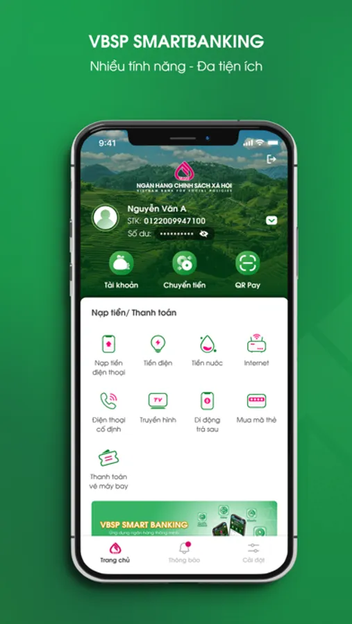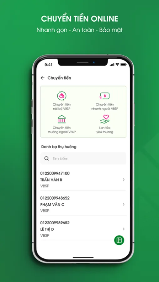 - Chuyển tiền: Chuyển tiền nội bộ VBSP, chuyển tiền nhanh 24/7 đến số tài khoản hoặc số thẻ tại Ngân hàng khác, chuyển tiền thường trong nước.
