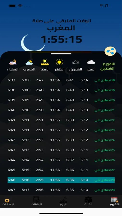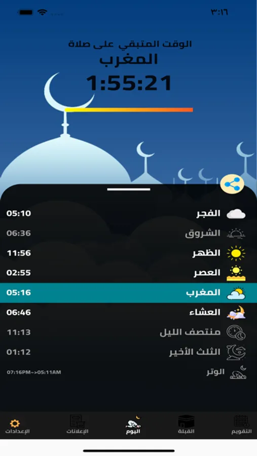 - المشاركة – شارك مواقيت الصلاة الخاصة بمدينتك عبر وسائل التواصل الإجتماعي.