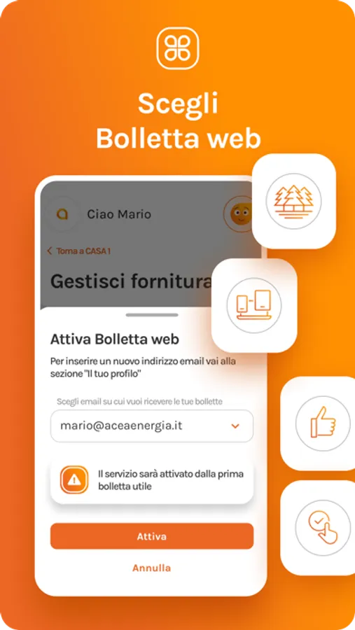 • Bolletta web: per ricevere gratuitamente la bolletta direttamente nella tua casella email, nel giorno della sua emissione eliminando la copia cartacea e facendo una scelta ecologica