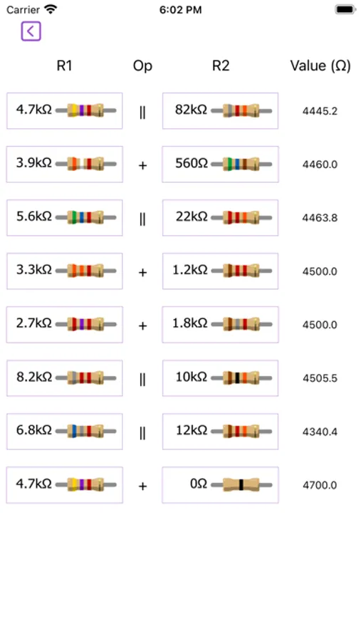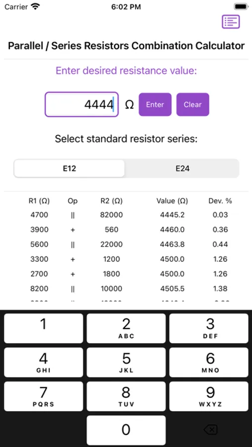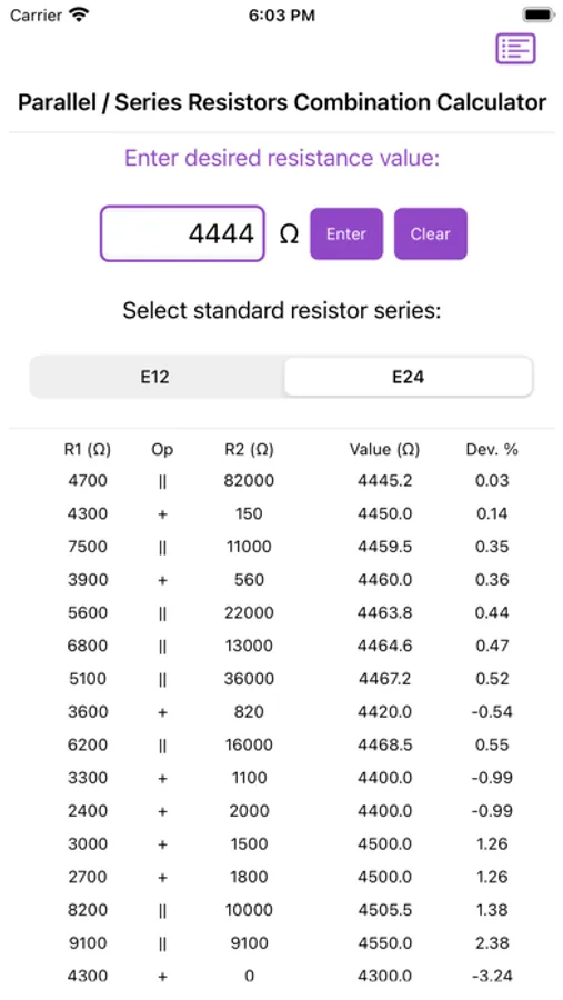 This tool calculates, which two standard resistors, series or parallel connection gives a closer approximation to a desired value of resistance using E12 (10%) or E24 (5%) series of resistors.
