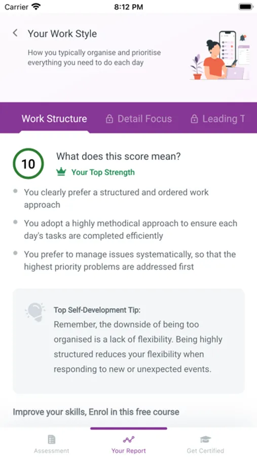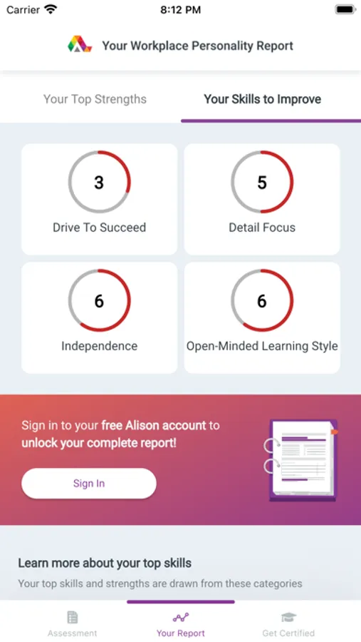 Once you’ve completed this test, you will get a preliminary result. For your full results, all you need to do is create a free Alison account so we can send you the complete report. There are no subscription or sign-up fees to do this - it is completely free!