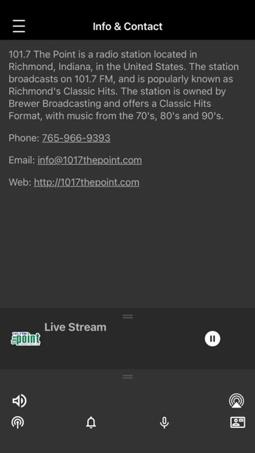 101.7 The Point is a radio station located in Richmond, Indiana, in the United States. The station broadcasts on 101.7 FM, and is popularly known as Richmond's Classic Hits. The station is owned by Brewer Broadcasting and offers a Classic Hits Format, with music from the 70's, 80's and 90's.