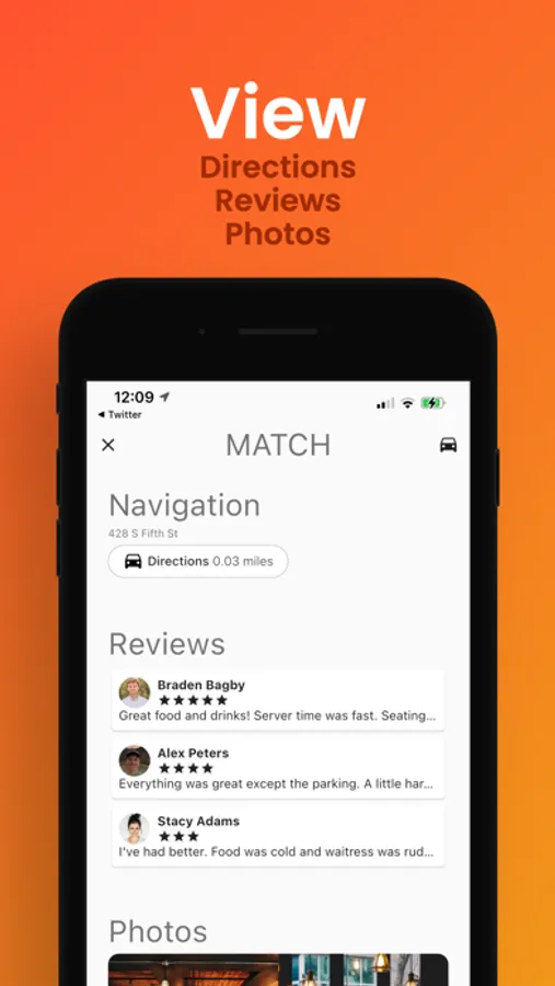 - view each restaurants directions, reviews, photos, distance, website, etc.