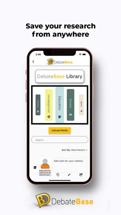 The DebateBase Library is your base for debate operations. Categorize and save links, documents, photos, and videos as references in your DebateBase library. Engage in debates with confidence by having all your supporting references ready to go. Collect and categorize your research and link it directly as citations in a debate. Use these references to improve your debate footing, share with collaborators through the ultra-private DebateBase Chat, help out an active debate by tagging your reference to someone else’s argument, or elevate the discussions on other social networks by sharing your research.