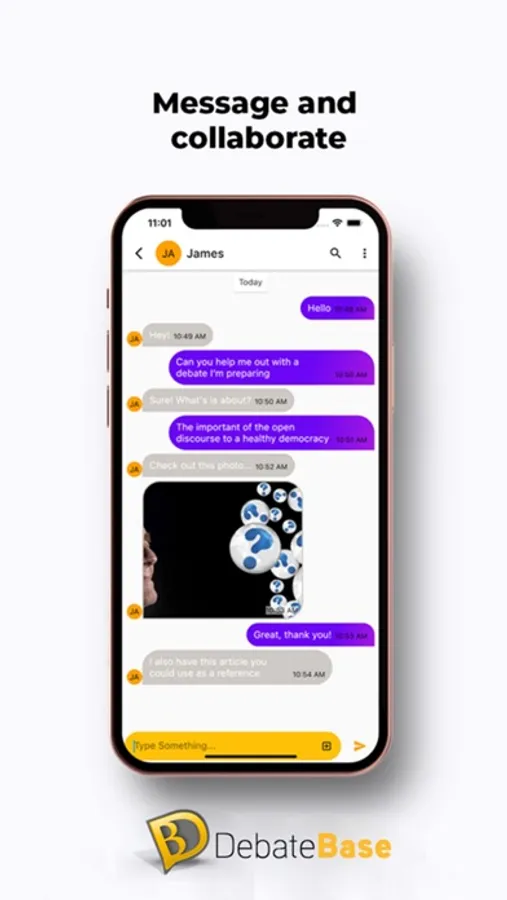 DebateChat leverages powerful End-to-End encryption so no one can read your messages or see what you send, giving you the peace of mind that your personal messages are outside the prying eyes of everyone, even us! Use the DebateChat to collaborate with others on a debate topic, exchange ideas and resources, and prepare for the live Debate experience.
