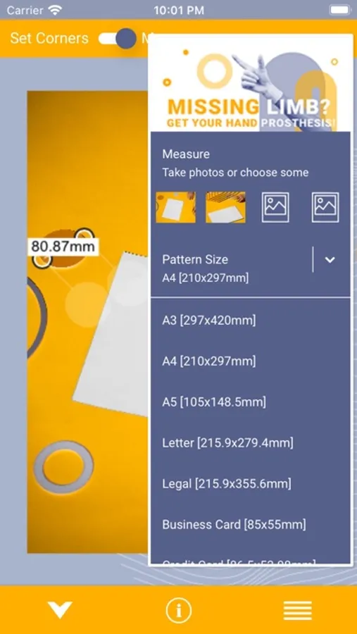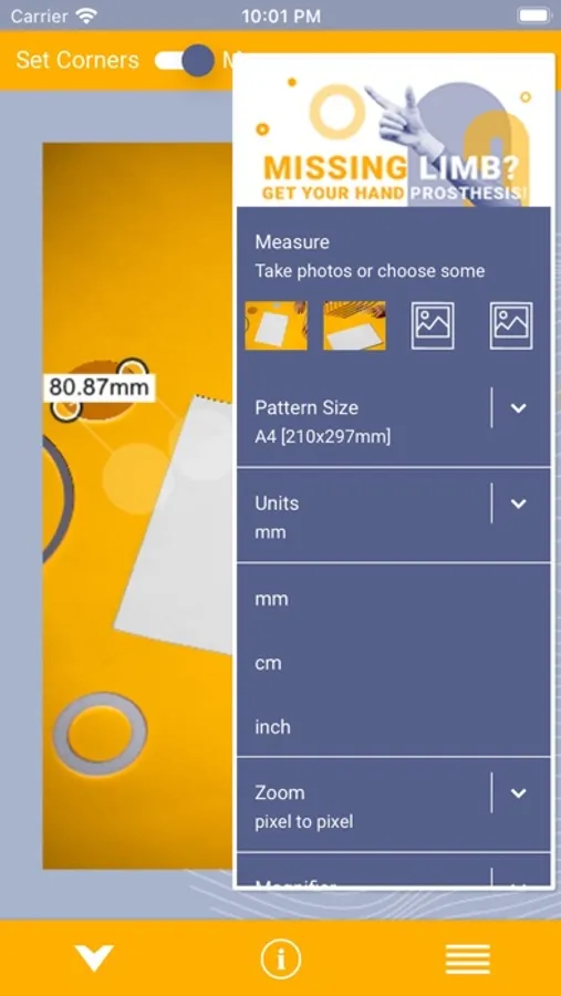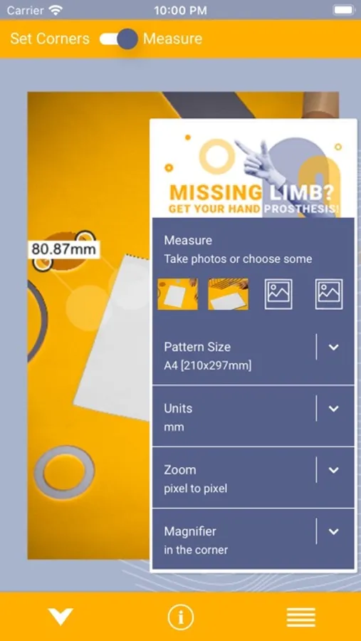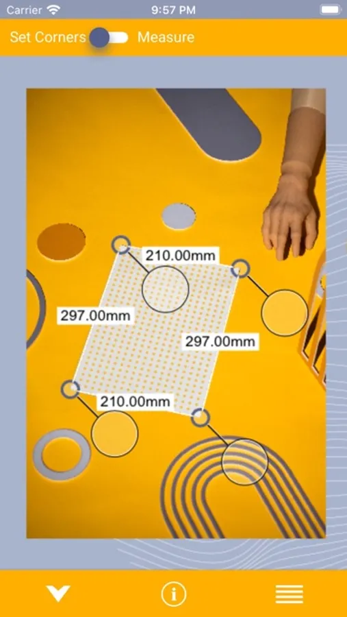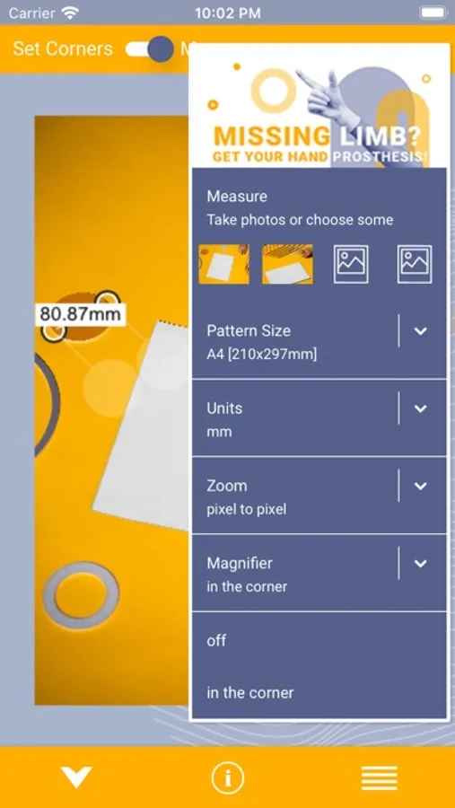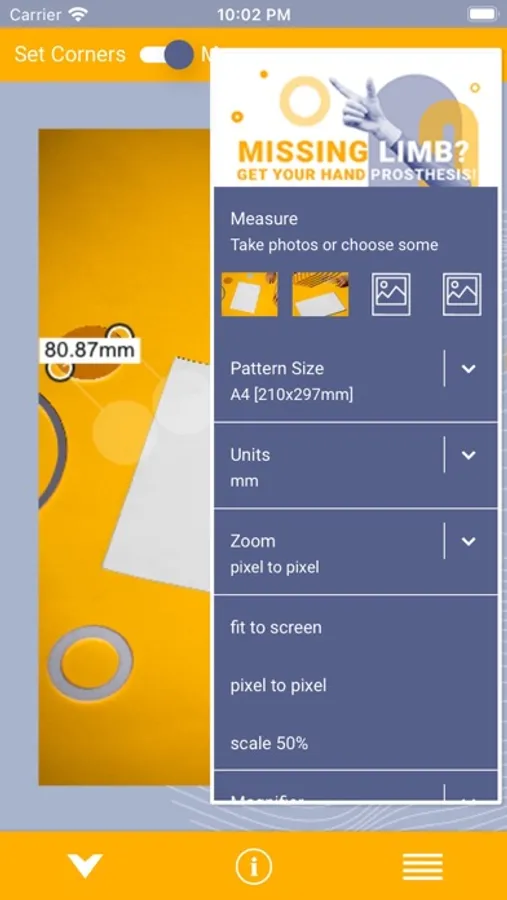 Select corners of your reference object. Use multiple combinations of settings that work for you best. You can zoom to fit the screen size, scale it to 50% or be sure that you move the image by 1 pixel selecting "pixel to pixel". Interact with the loaded image moving it with one finger, zooming in and out with two and bringing it back to "fit to screen" possition with double tap. Decide how you want to use the magnifier option - in the corner, next to the cursor or under it. It helps to mark corners precisely.