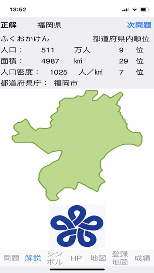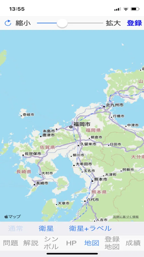 問題数を選んで、[開始]をタッチすると、地図の地形と解答の選択肢が表示されます。