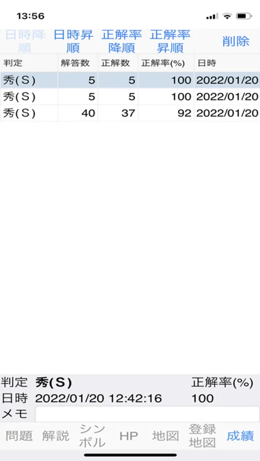 最後まで解答すると、判定結果が表示されます。成績のよい順に、秀(S)、優(A)、良(B)、可(C)、不可(D)となり、データベースに登録されます。日時、正解率でソートできます。