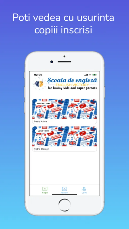 Aplicatia EnglishVictory permite parintilor sa vada datele copiilor inscrisi la scoala EnglishVictory.