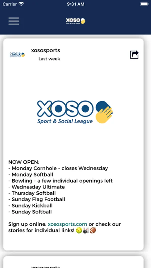 Keep up to date with everything Xoso! Chat with your team, get game reminders, RSVP, schedules / standings / rainout alerts and other notifications!
