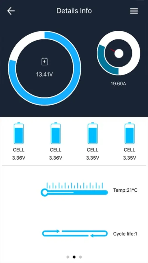 2.Monitor your battery’s health, individual cell voltage, Amp hour capacity, internal temperature and number of cycles. Easily access your battery’s State of Charge (SOC) details from the basic info screen.
