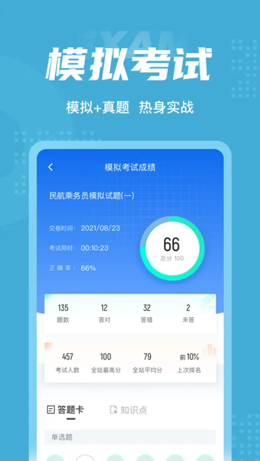 民航安全检查员题库内含考点练习,全国通用卷以及地区卷模拟练习,以及按照固定考试比重的随机式的抽题的真题考场,成绩单实时记录考试数据,一点一滴的反馈考生近期学习状态以及自我正确率的提升,大大的给予考生通过考试的信心。