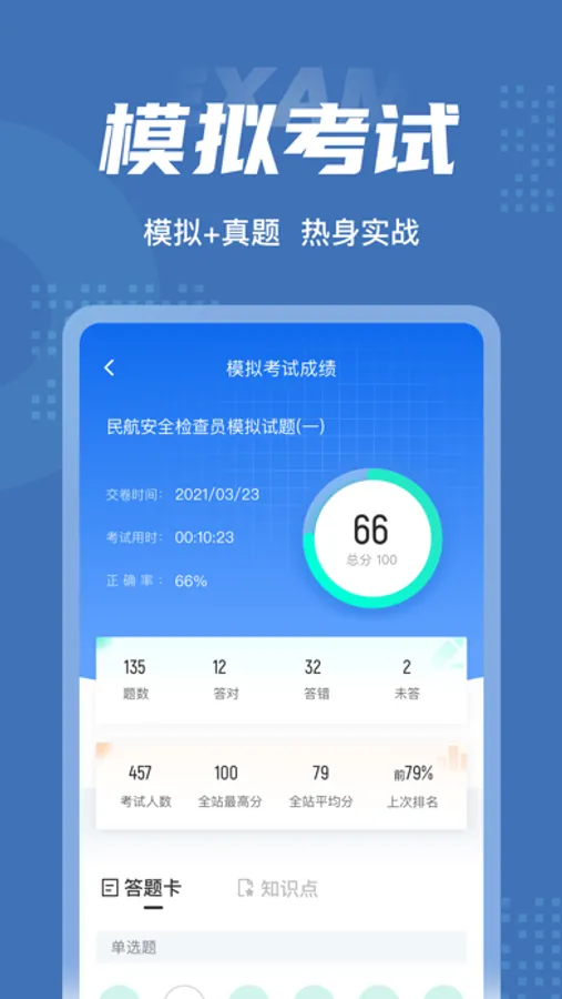 民航安全检查员题库内含考点练习,全国通用卷以及地区卷模拟练习,以及按照固定考试比重的随机式的抽题的真题考场,成绩单实时记录考试数据,一点一滴的反馈考生近期学习状态以及自我正确率的提升,大大的给予考生通过考试的信心。