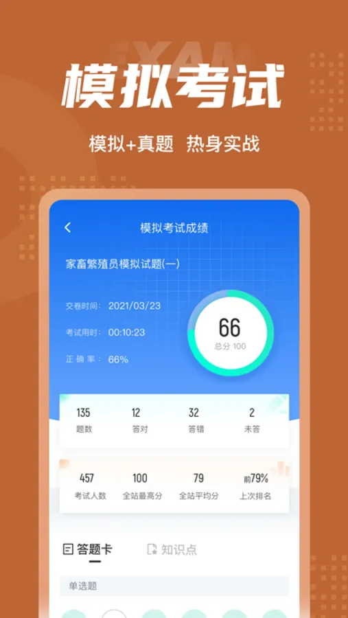家畜繁殖员题库内含考点练习,全国通用卷以及地区卷模拟练习,以及按照固定考试比重的随机式的抽题的真题考场,成绩单实时记录考试数据,一点一滴的反馈考生近期学习状态以及自我正确率的提升,大大的给予考生通过考试的信心。