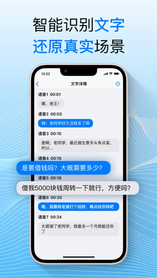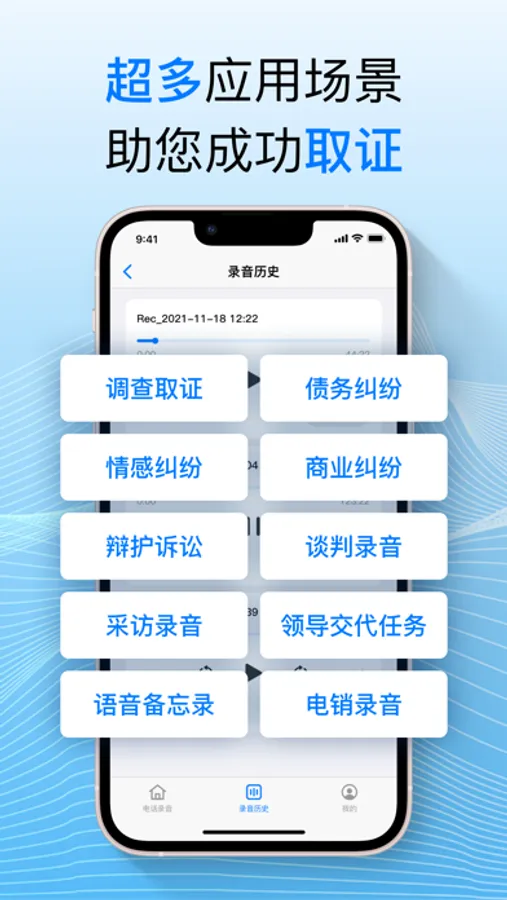 1、调查取证2、债务纠纷3、情感纠纷4、商业纠纷5、辩护诉讼6、谈判录音7、采访录音8、领导交代任务9、语音备忘录等等适用各种场景,满足不同司法取证需求!