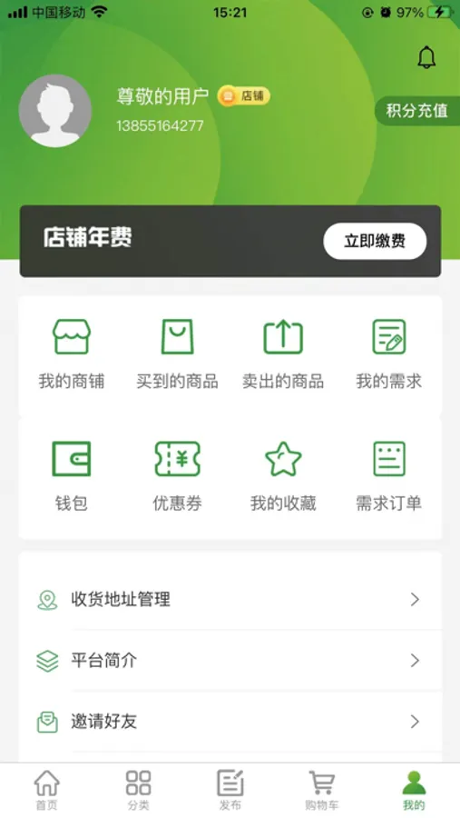 2、缴纳年费功能:App账户分为个人和商家两种角色,成为商家需要按年向平台缴纳年费,该页面为店铺缴纳年费入口;