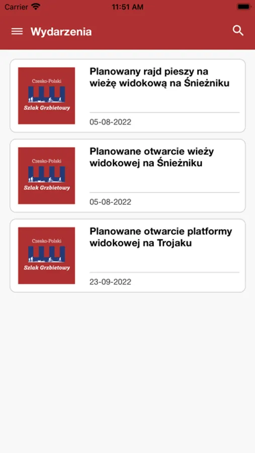 Aplikacja oferuje dostęp do planowanych wydarzeń. Dzięki niej otrzymasz powiadomienia o nowościach związanych ze Szlakiem Grzbietowym.