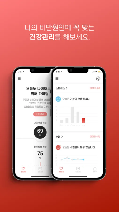 - 사용자 비만원인과 무관한 체중조절 방법을 제공하지 않아 비효과적이고 소모적인 다이어트를 방지합니다. 각 프로그램별 수행률을 그래프로 볼 수 있어 좀 더 체계적인 다이어트가 가능합니다.