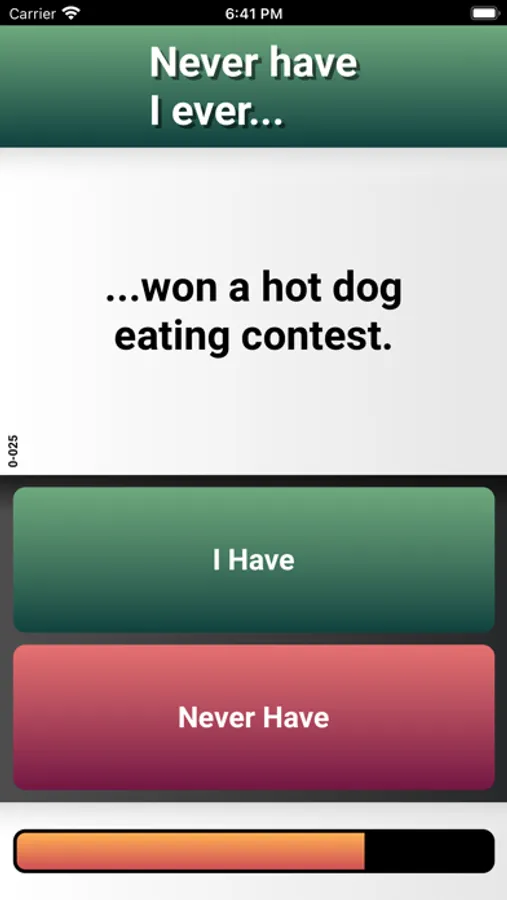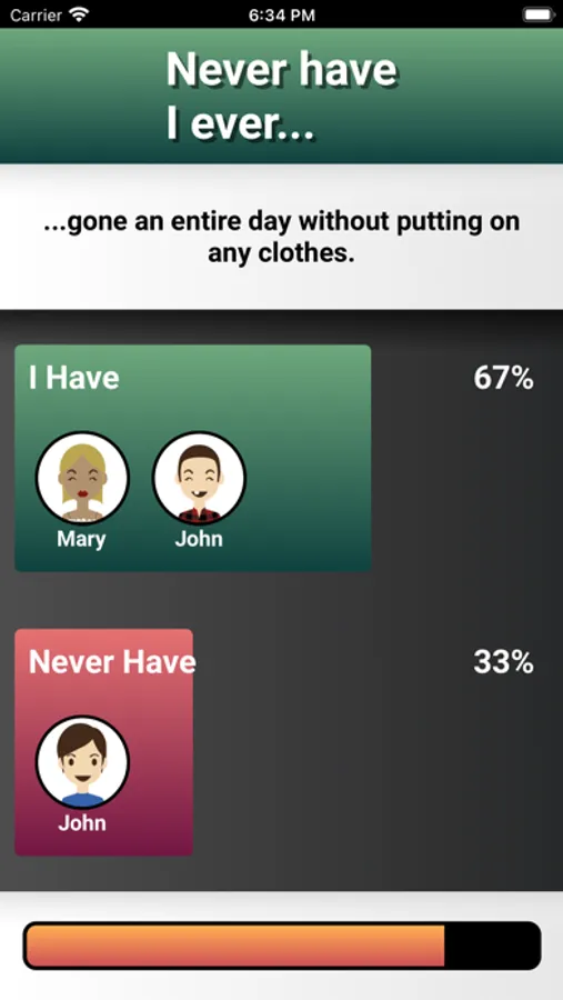 * 2 game modes: Either everybody answer the questions or one player has to guess what the others have or never have done.