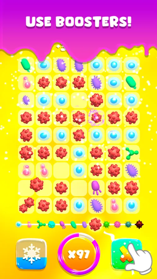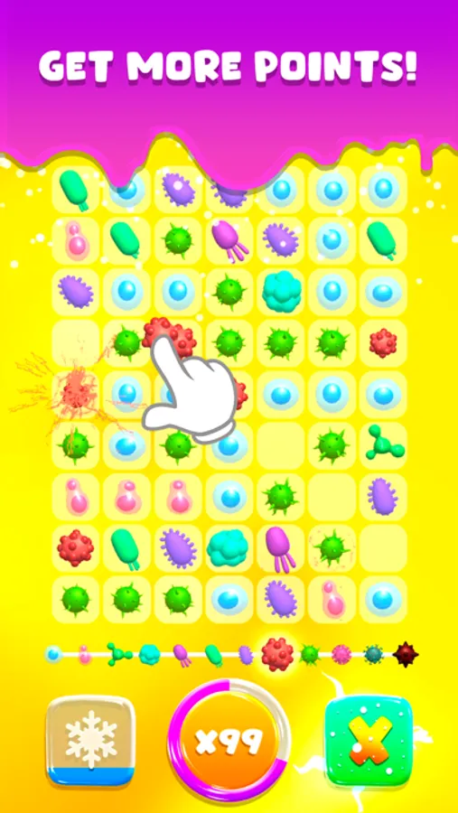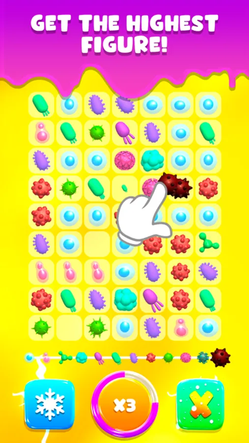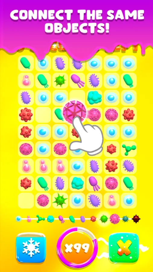Find the same elements and connect them, each connection gives points, the higher the figure - the more points you get when you connect it. Get to the top figures and get the maximum number of points.