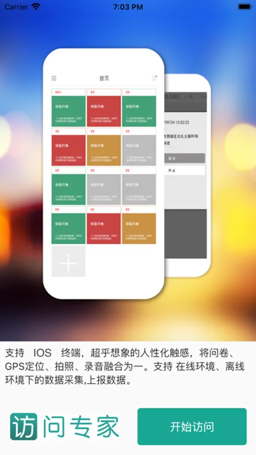 系统以简单化的操作,支持专业的问卷题型和逻辑,支持问卷续答、拍照、录音、定位、手写签名、断点续传等功能!