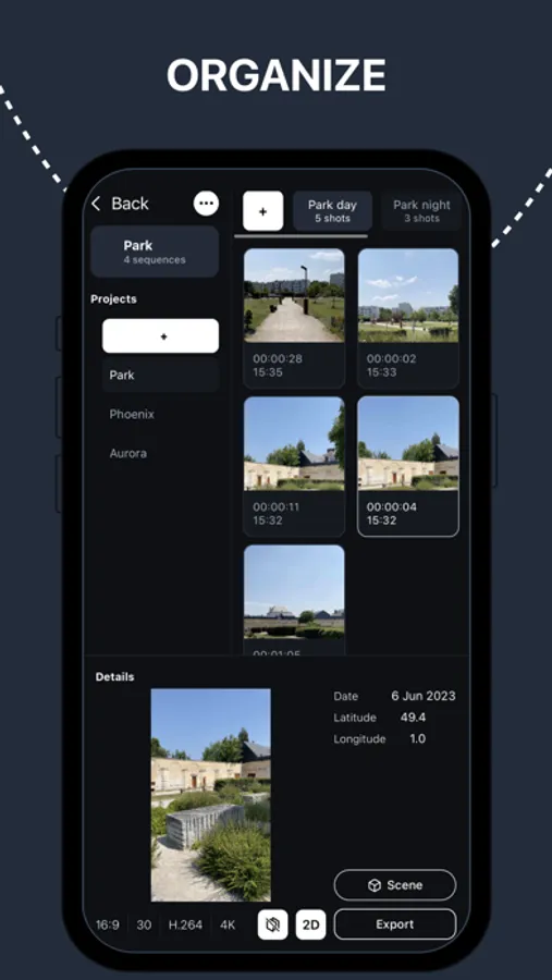 Manage your shots by project/sequence and export them as a folder containing: