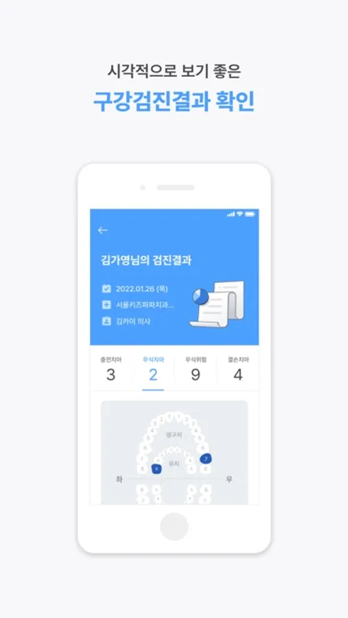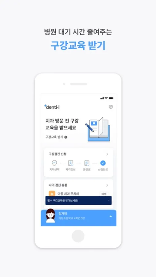 덴티아이를 통해 구강검진 신청하기, 검진 대상 조회하기, 지정병원 찾기, 구강검진 결과 조회하기, 구강교육 받기를 이용해 보세요.
