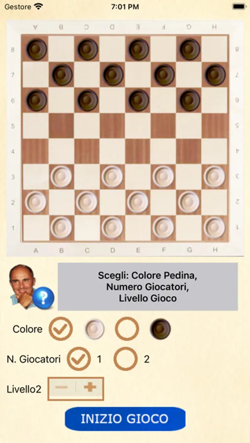 Se scegliate il colore bianco, come da regola, giocherete per primi altrimenti giocherà per prima l'applicazione.