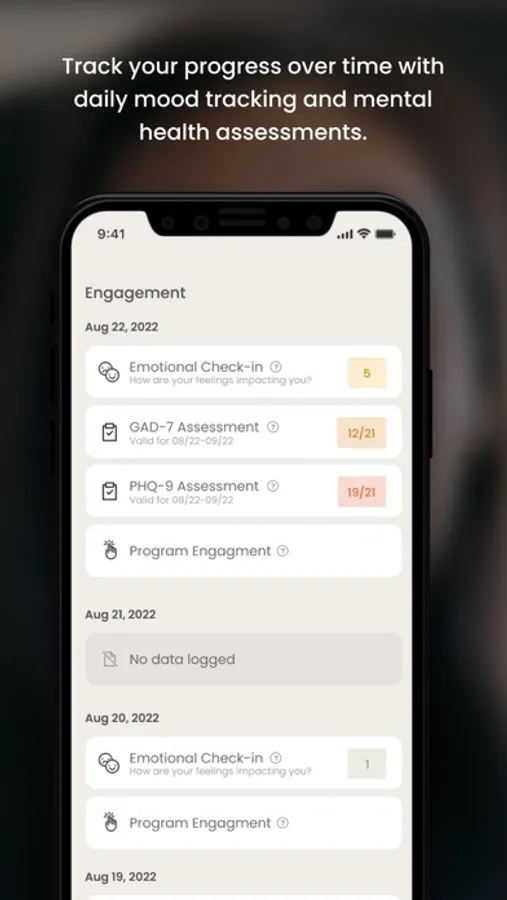 • You now have greater insight into your progress! We have added a health data tab to the client dashboard, offering you anytime access to your clinical assessment results and previously logged moods, as well as insight into your progress and compliance with your program.