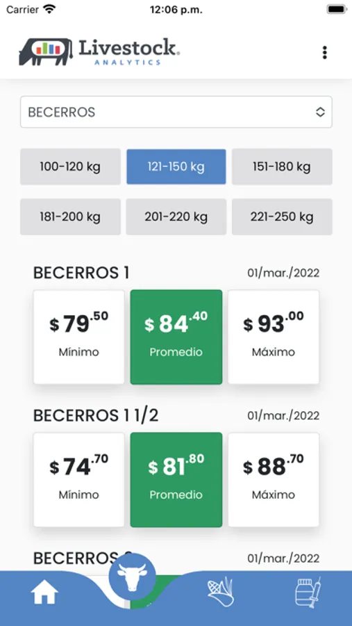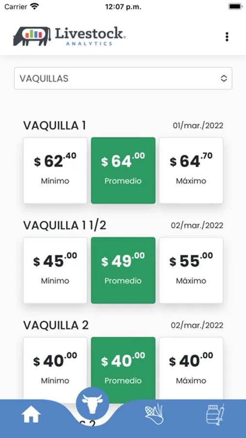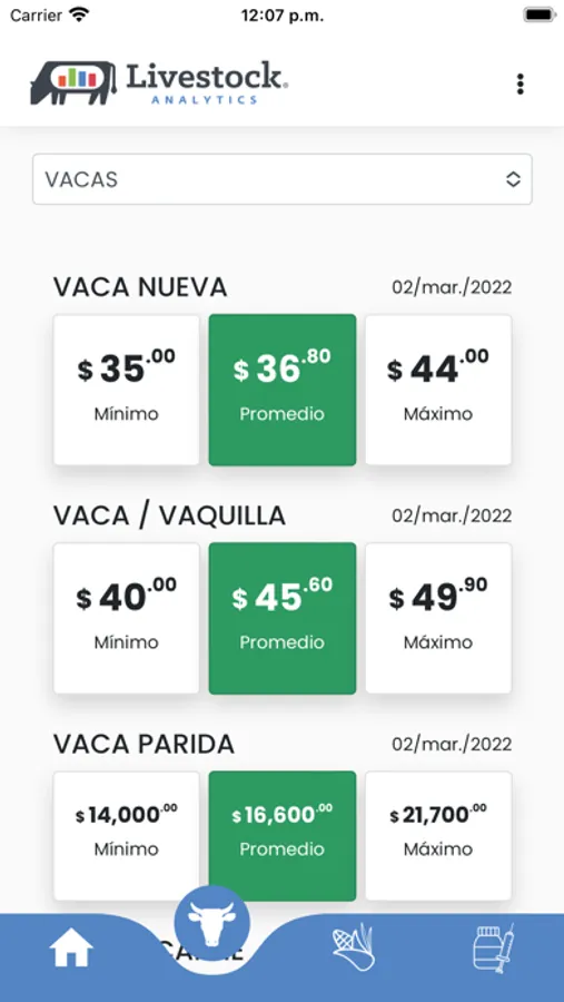 La app te muestra el precio promedio para cada categoría, así como el precio mínimo y máximo observado en la última fecha disponible. Seleccionando el precio de interés podrás consultar el histórico de precios hasta 90 días atrás tanto en gráfica cómo en tabla. También podrás ver datos sobre la cantidad de animales y peso promedio de cada fecha.
