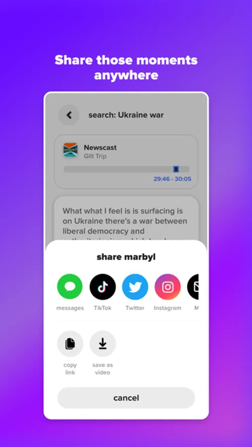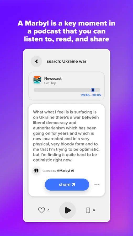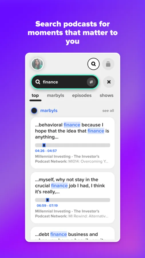 Your time matters. With Marbyl, you can bypass the noise and get straight to the podcast content that matters to you. No more ’scrub to this timecode’ or long listens to determine if an episode contains what you searched for. Be brought straight to what you needed to hear.