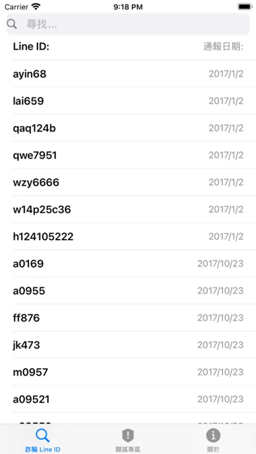 此APP提供165反詐騙諮詢專線受理民眾檢舉、報案的詐騙LINE ID,你可以在清單的最上方輸入查詢,清單中會將符合查詢項目的 LINE ID 列出 ,並顯示出被通報的日期。