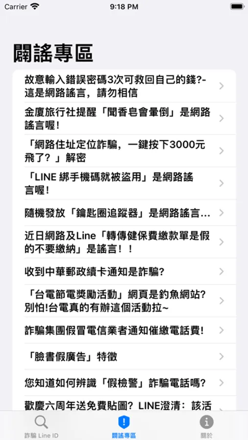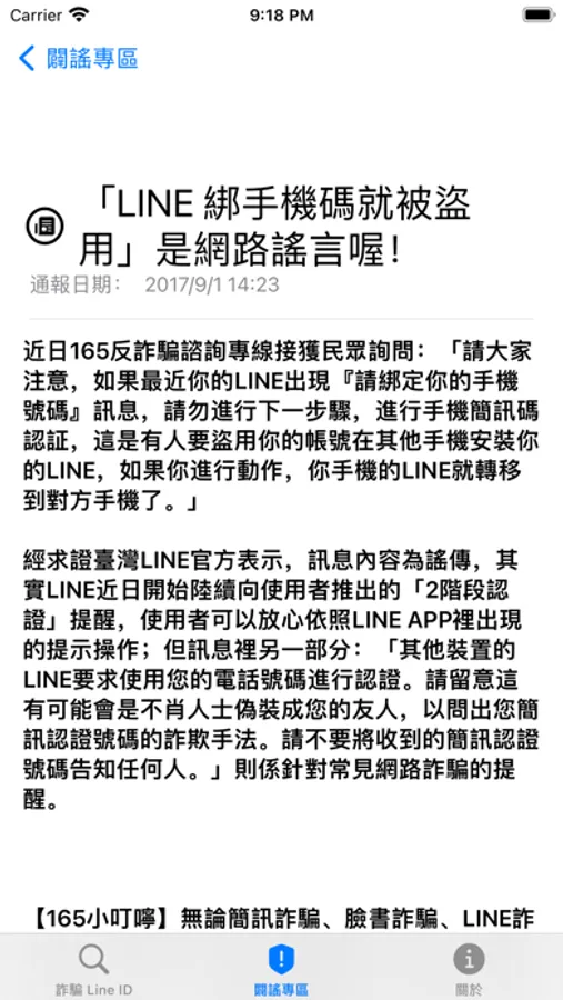 此APP提供165反詐騙諮詢專線,詐騙闢謠資訊,清單中列出相關標題。