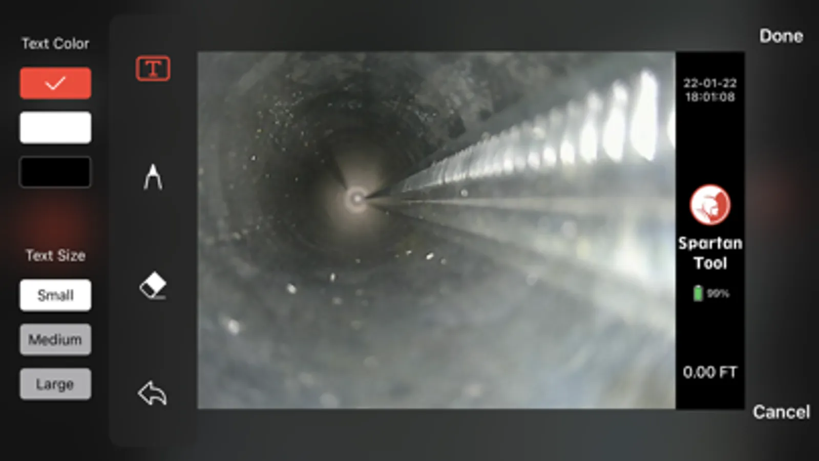 The Spartan Vision app is designed to work with Spartan pipe inspection cameras. Spartan Vision features a user-friendly interface to make your inspection jobs a breeze. Rotate and zoom your view with on-screen controls and one-touch reset for optimizing your view inside the pipe. Adjust the camera’s LED intensity with simple controls for better visibility. Easily add on-screen text notes, record audio voiceover narration for your video files, and take screenshots directly in the app.
