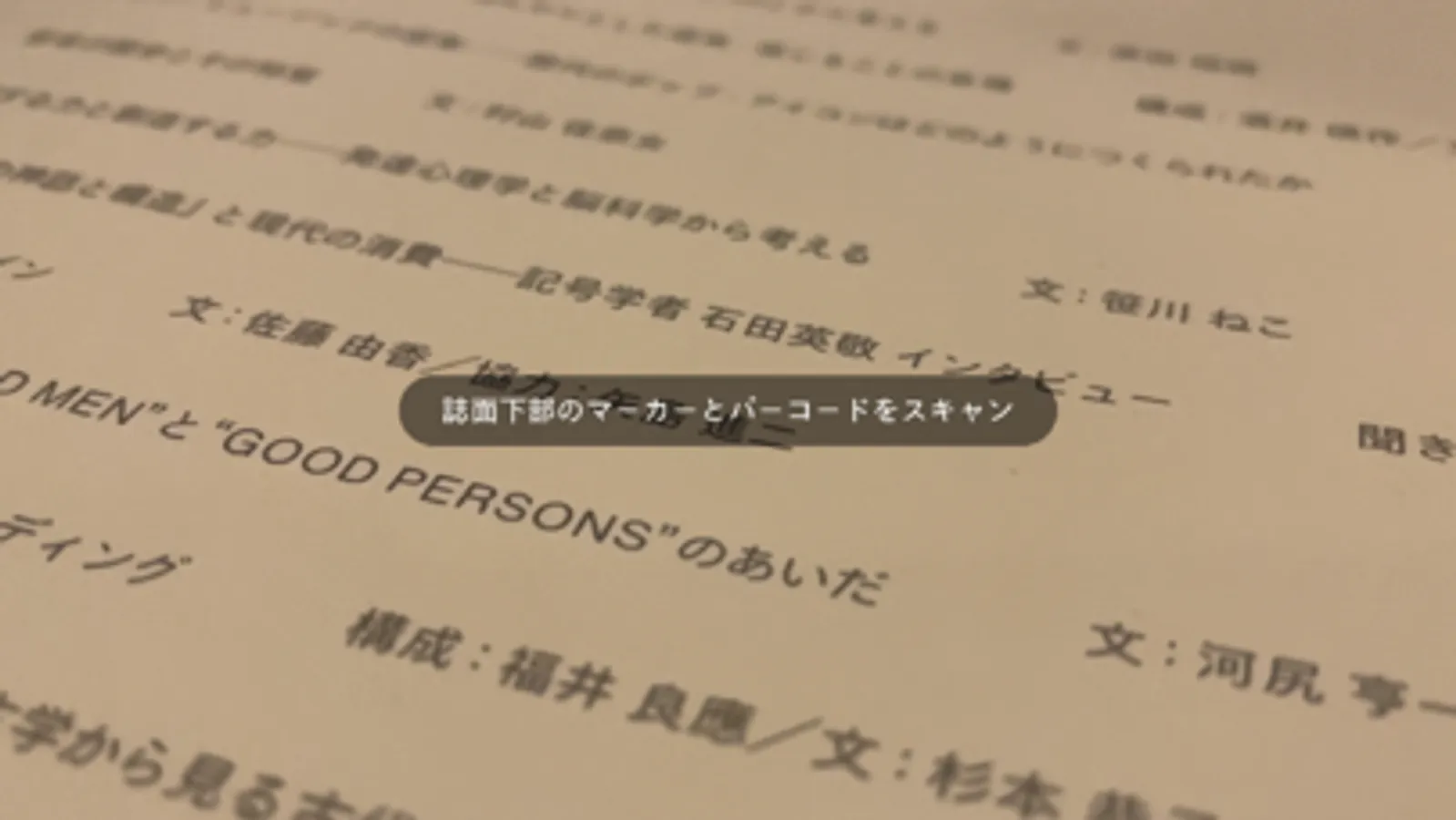 誌面下部にあるマーカーとバーコードにカメラを向けてスキャンすると、各記事、各ページで異なるARが表示されます。