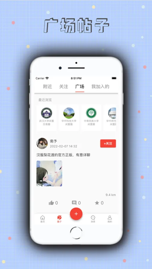 (6)发布帖子:用户可以发布好玩有趣的帖子到“广场”上,附近的用户可以浏览到。